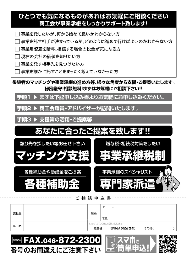 2025年問題「全国約275万人の経営者が70才以上に、うち約127万人は後継者不足による廃業危機に陥る」と言われています。それは逗子市も例外なく訪れようとしています。愛着ある地域のお店を残すために、商工会職員と事業承継・M&Aに詳しい専門家とお伺いし、今後の不安や課題の解決を目指します。一つでも気になることがございましたら、お気軽にお問合せください。お問合わせ先:TEL046-873-2774