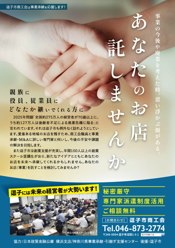 2025年問題「全国約275万人の経営者が70才以上に、うち約127万人は後継者不足による廃業危機に陥る」と言われています。それは逗子市も例外なく訪れようとしています。愛着ある地域のお店を残すために、商工会職員と事業承継・M&Aに詳しい専門家とお伺いし、今後の不安や課題の解決を目指します。一つでも気になることがございましたら、お気軽にお問合せください。お問合わせ先:TEL046-873-2774