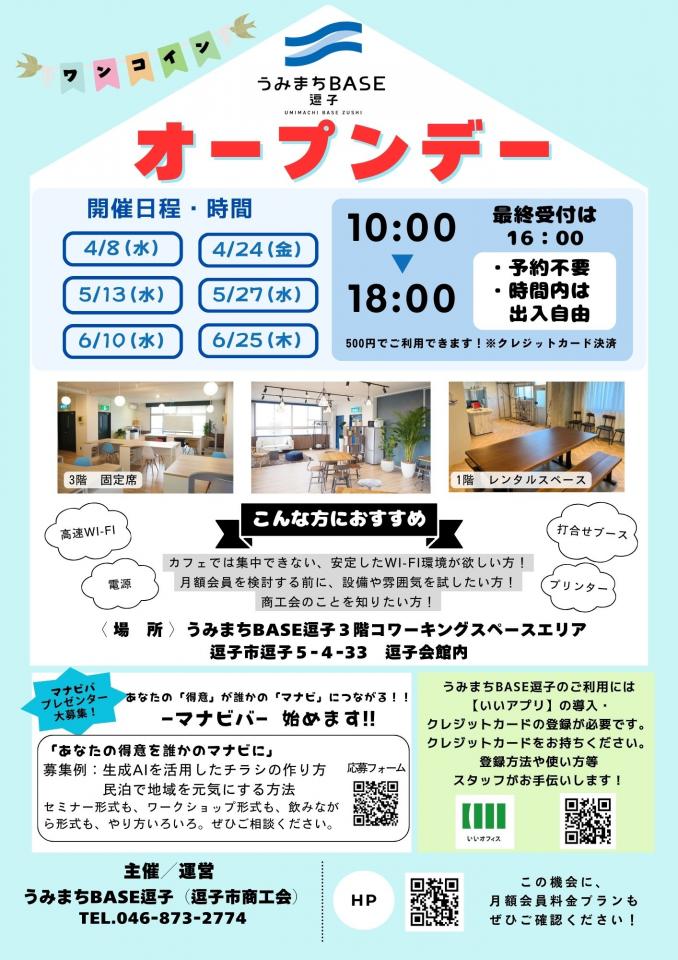 逗子市商工会が運営するコワーキングスペース「うみまちBASE逗子」では、1日500円で利用体験できるワンコインオープンデーを開催します。