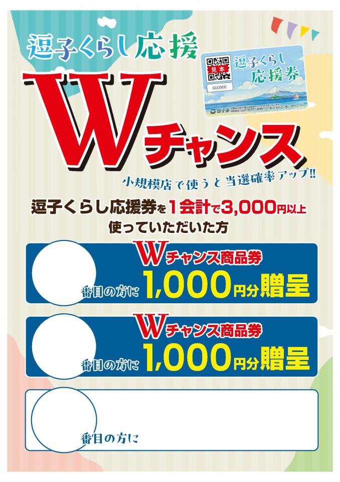 企画内容:各店舗にて1会計で3,000円以上、逗子くらし応援券を使っていただいたお客様〇人目(各店舗が設定)の方にWチャンス商品券1,000円分を贈答致します。